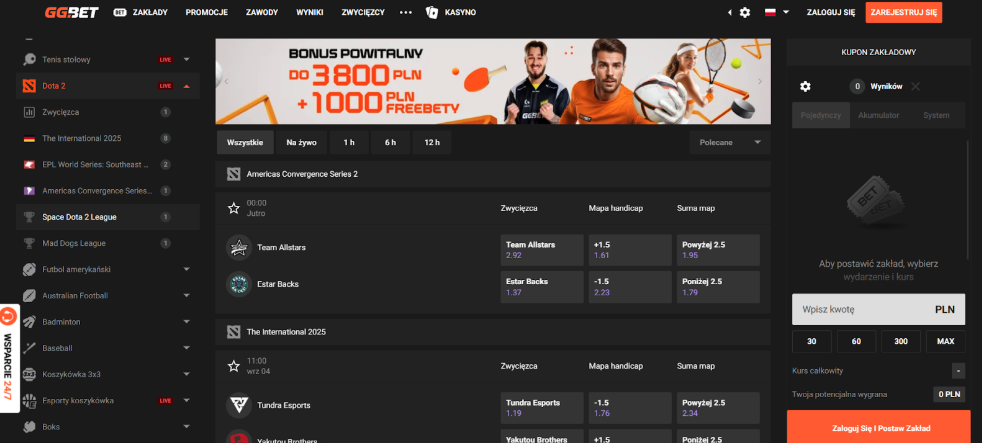 W GGBET można obstawiać ponad 20 dyscyplin e-sportowych, w tym CS2, Dota 2, League of Legends, Valorant, Overwatch, Call of Duty, StarCraft II i PUBG. Aktualny harmonogram można sprawdzić w sekcji E-sport na głównej stronie operatora.